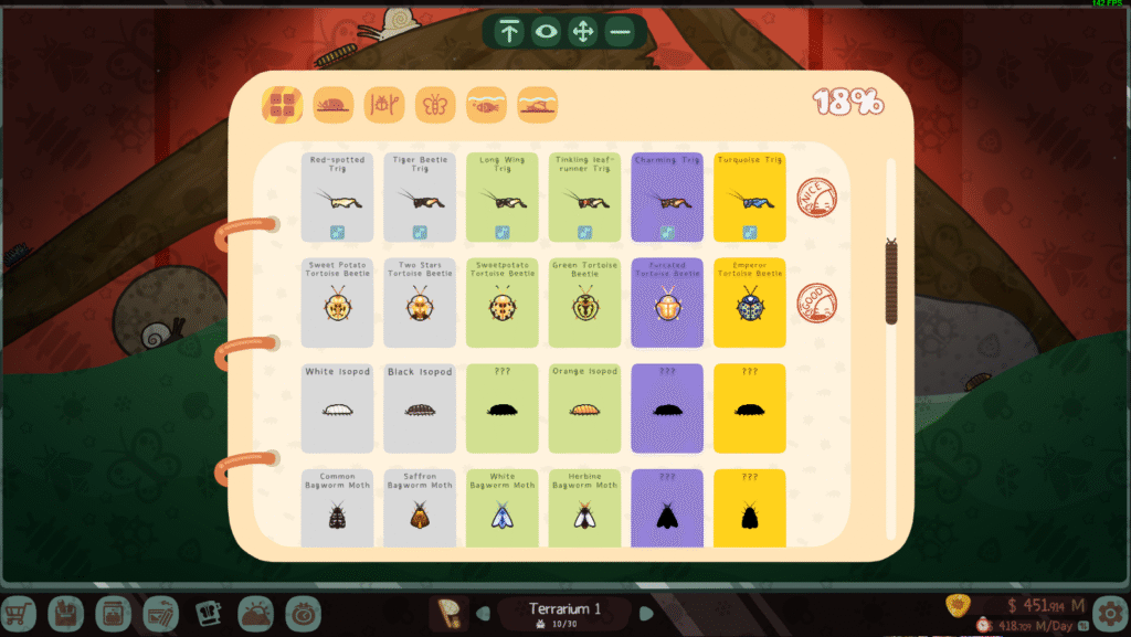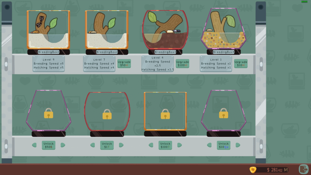 Łącząc ze sobą dwa insekty tego samego koloru, mamy większą szansę na zdobycie okazu z grupy wyżej. Np. umieszczając w inkubatorze dwa robaczki koloru zielonego, otrzymamy takiego w kolorze zielonym lub fioletowym. Analogicznie jeżeli umieścimy dwa fioletowe, to mamy szansę na złoty okaz. Oczywiście im większa rzadkość (kolor) tym nasza pociecha zarabia dla nas więcej pieniędzy. Odblokowywanie owych rodzajów nie wiąże się jednak tylko z dochodem, który otrzymujemy. W grze występuje coś takiego jak encyklopedia. Uzupełniając ją we wszystkie okazy z danego gatunku, odblokowujemy elemnty upiększające dla naszego terrarium.