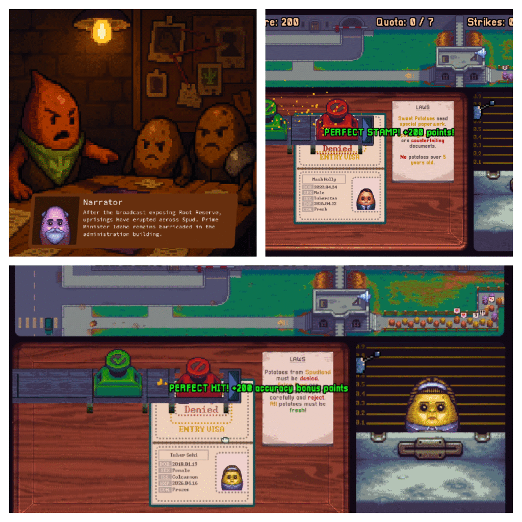 Tym razem na tapetę poszła gra Spud Customs. Jest to tytuł nawiązujący swoim gameplayem i mechaniką do Papers, Please. Tytuł ten jest jednak zdecydowanie mniej rozbudowany. Graficznie, jak w poziomach prezentuje się przyzwoicie, tak w cutscenkach wygląda to już raczej dość średnio. Nierówne piksele, dziwne kolory. Całość wygląda, jakby została narysowana w małej rozdzielczość i na chamsko przeskalowana w programie do obróbki graficznej.